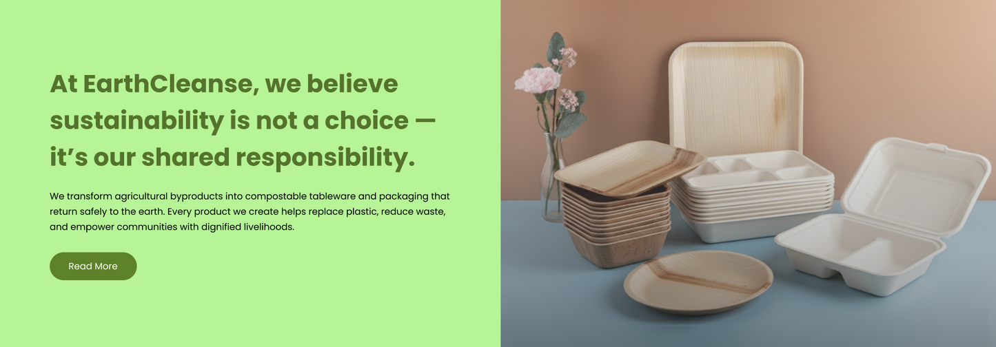 At EarthCleanse, we believe sustainability is not a choice — it’s our shared responsibility.We transform agricultural by-products into compostable tableware and packaging that return safely to the earth.