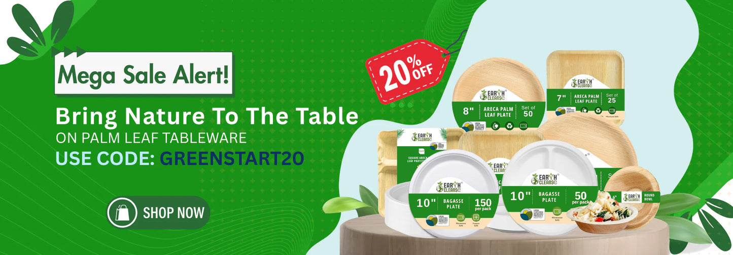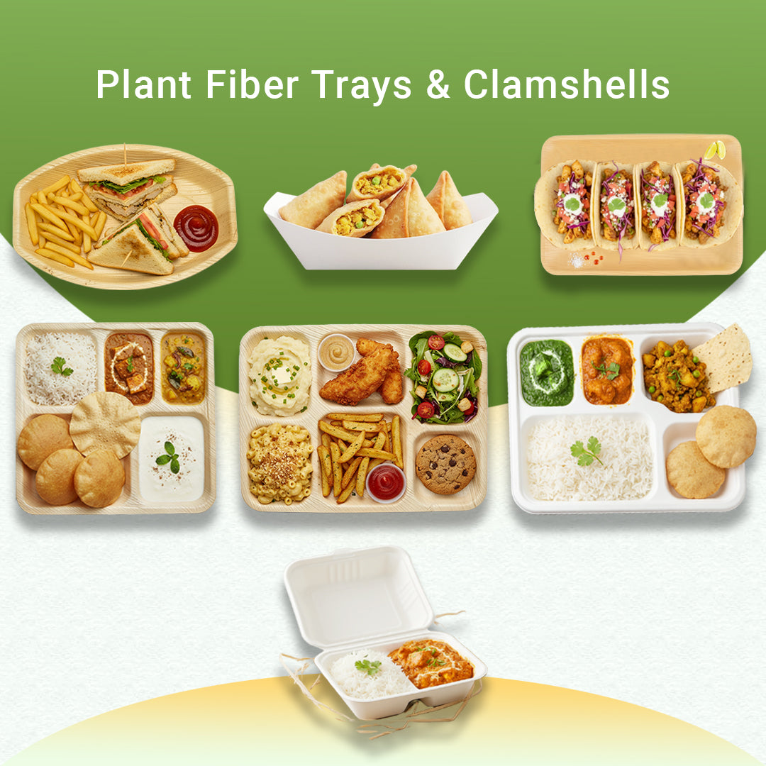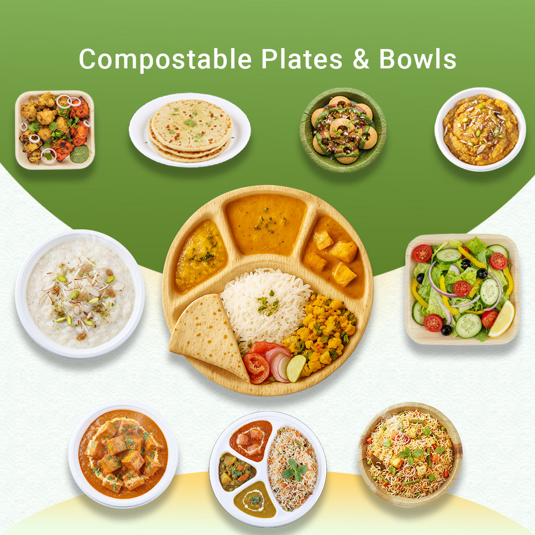 Discover compostable, plastic-free essentials made from palm/Sal leaves, bagasse, birchwood, plant-based bioplastics, chlorine- and sulphate